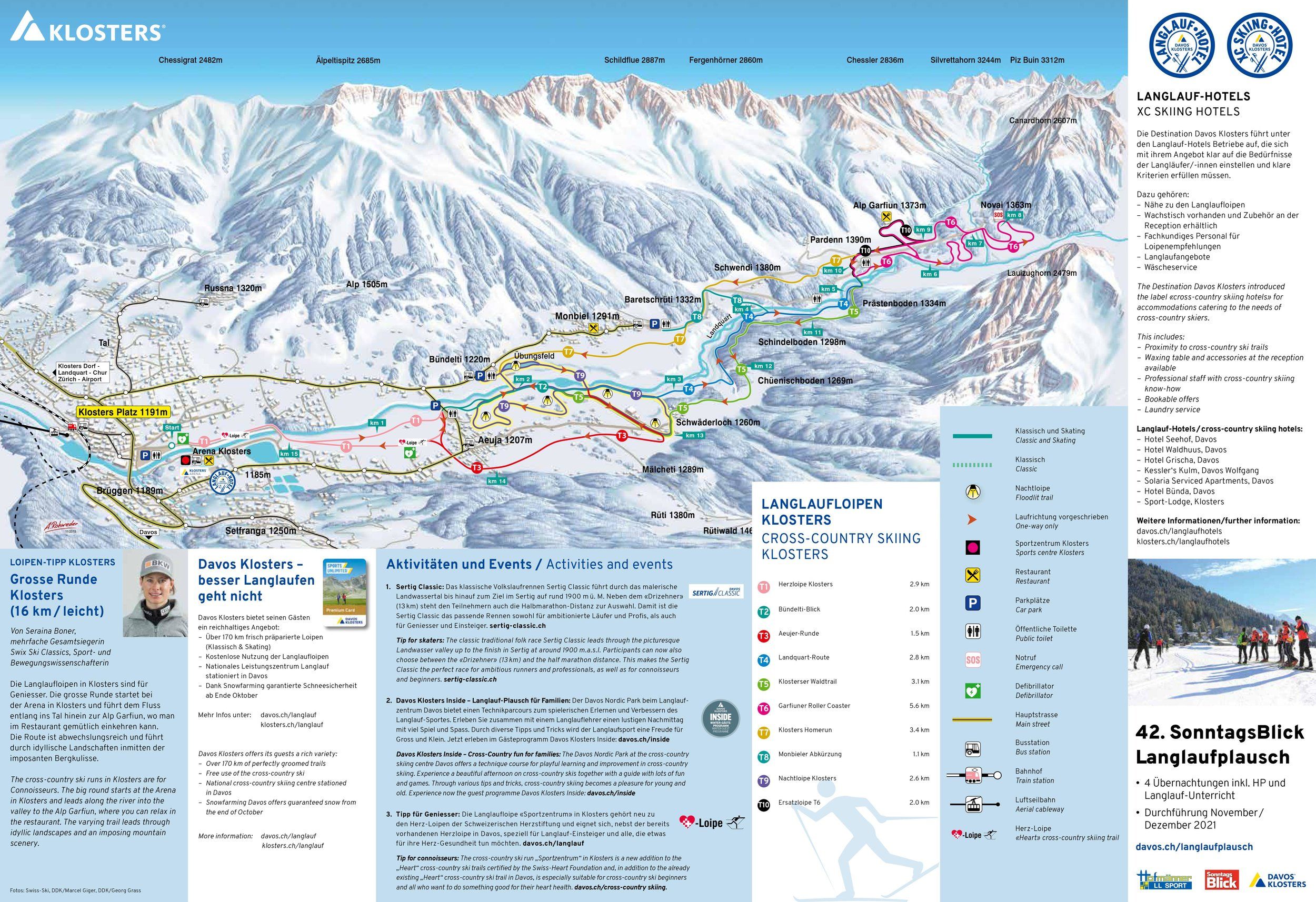 About 18.5 km of cross-country trails are also marked as special dog trails, so you can take your four-legged friends with you. The 24 km route from Davos via Mühle to Sertig is a dream for experienced cross-country skiers. The high-altitude circuit to Novai and Garfiun should only be attempted by those in good physical condition. The cross-country skiing fun can be extended in the evening on the floodlit night trail, which is approx. 2.5 km long.